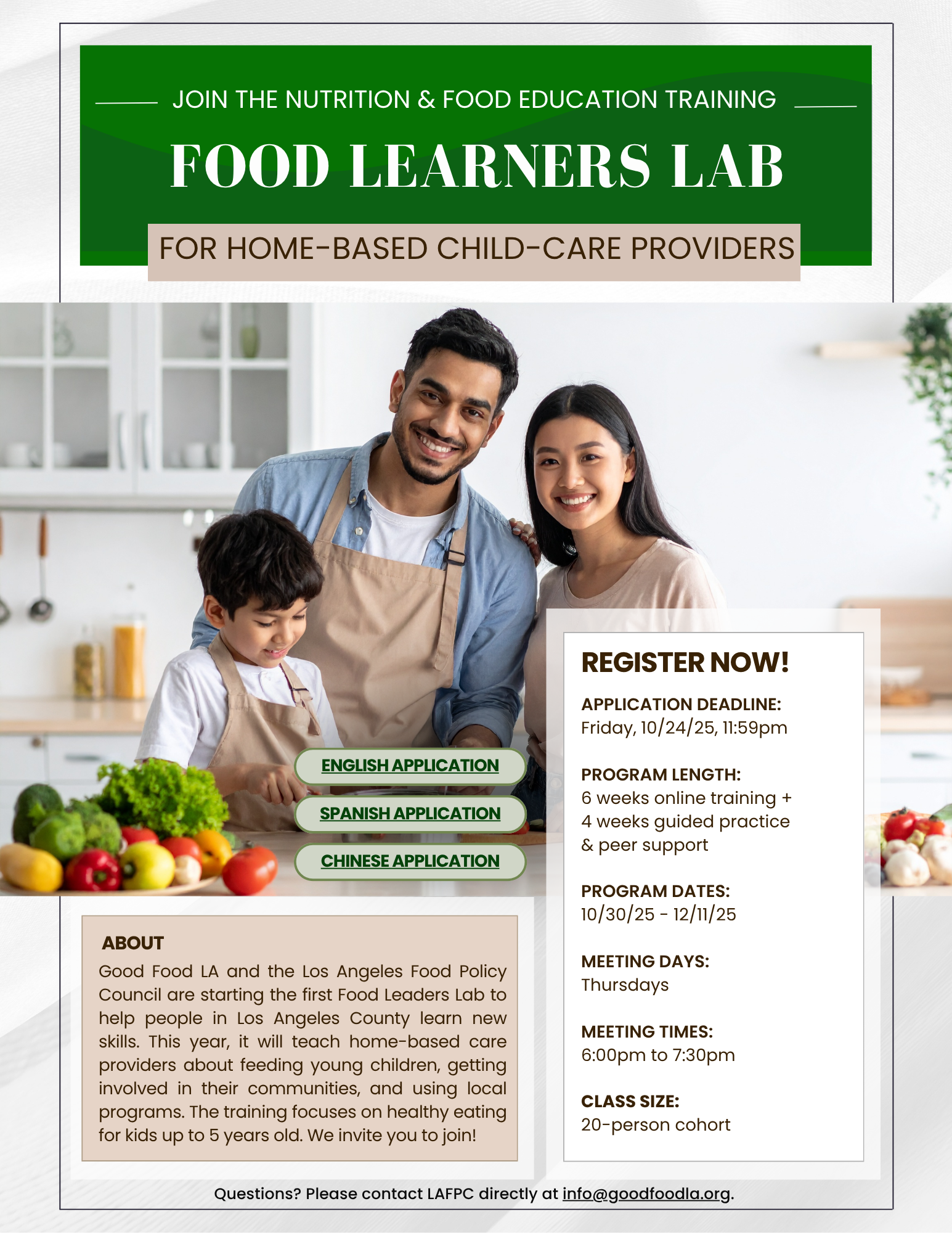 Good Food LA and the Los Angeles Food Policy Council are starting the first Food Leaders Lab to help people in Los Angeles County learn new skills. This year, it will teach home-based care providers about feeding young children, getting involved in their communities, and using local programs. The training focuses on healthy eating for kids up to 5 years old. We invite you to join!