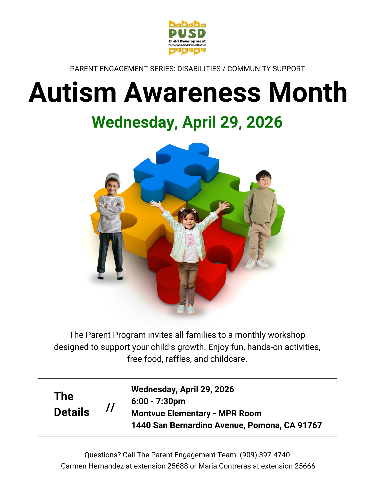 Join us to learn ways to support your child’s growth and learning while raising awareness about autism. There will be fun activities, free food, raffles, and childcare for families.